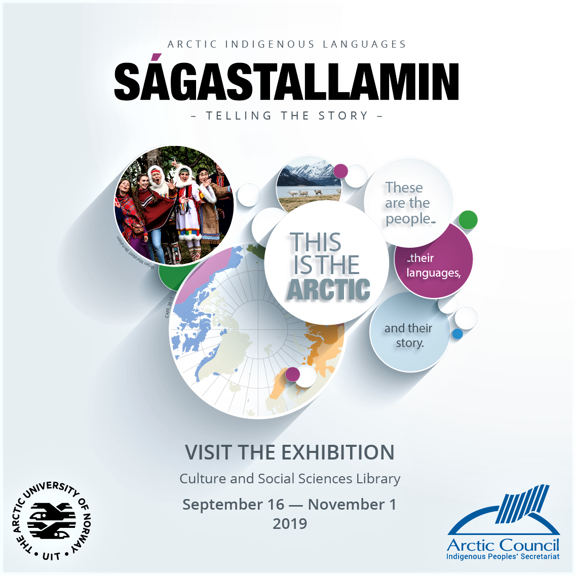 “Ságastallamin: Telling the Story” presents the Arctic region, the Peoples therein, and the languages they speak. The exhibition describes some challenges the languages have faced in the past and ones they continue to face into the modern day. Because the exhibition originated in Sámi homelands, one poster is dedicated to Sámi languages.